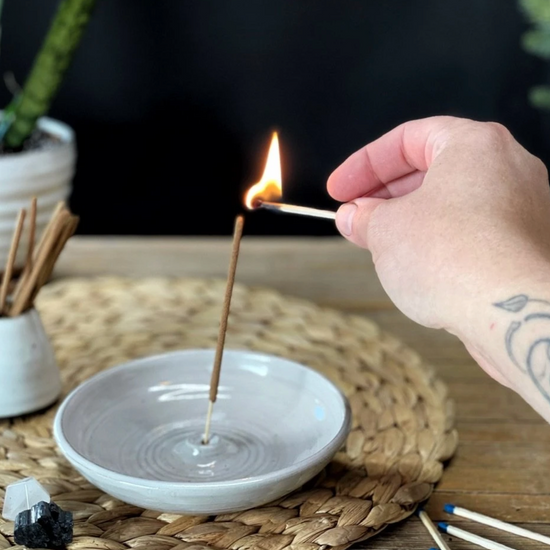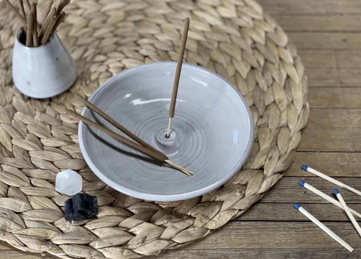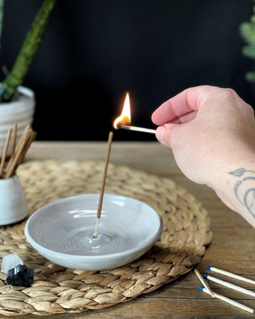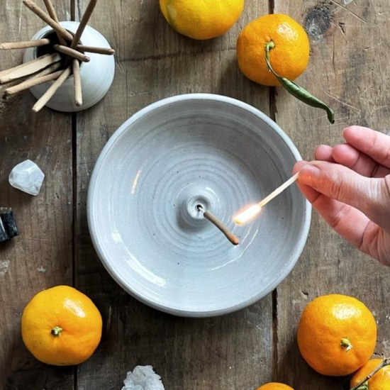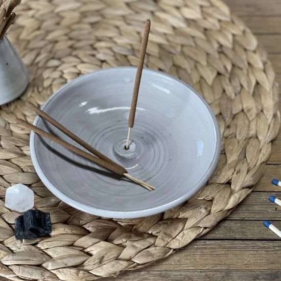 The gentle smoke of all natural, hand rolled incense can change the mood of a room or mark the transition between work and home with intention. The Gravesco handmade pottery incense burner will gracefully hold your incense stick catching any ash that falls, protecting your table top.