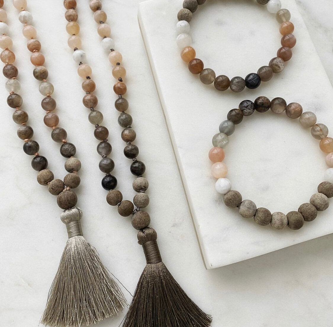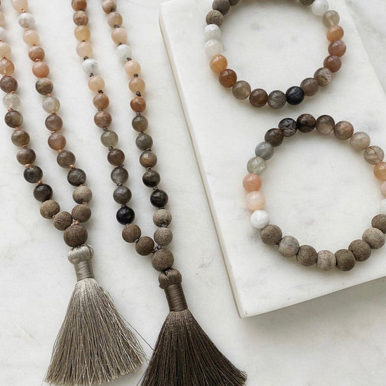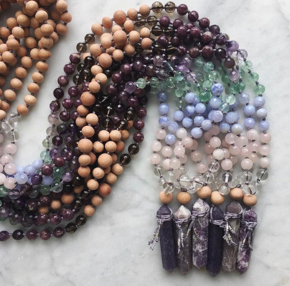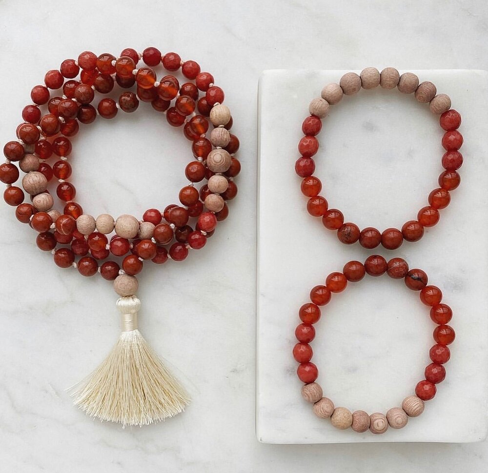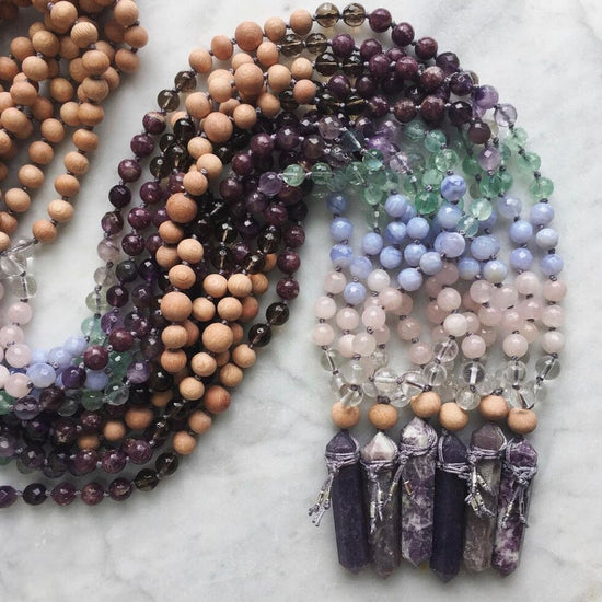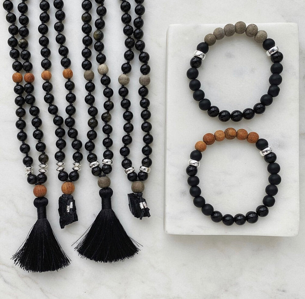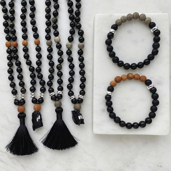 Malas are one of the latest fashion trends to hit the yoga space, but their origin and history goes back to the birthplace of yoga. The term mala is derived from the Sanskrit word “Japamala,” which is a string of beads used for prayer and meditation by Hindus and Buddhists (similar to the concept of a Rosary in the Catholic faith). The string is made up of 108 individual beads, which are used to keep count while chanting or repeating a mantra while meditating. Our Malas can also be used to diffuse essential oils on the lava rock or rosewood beads.