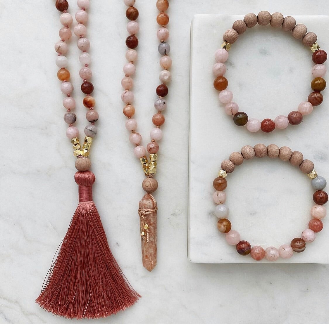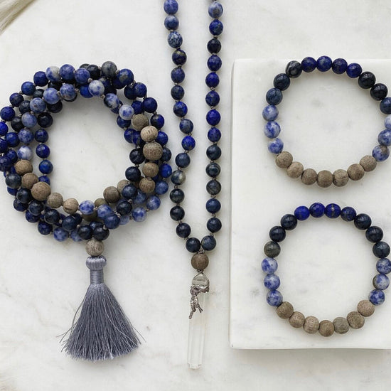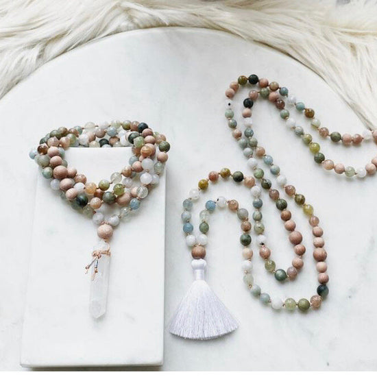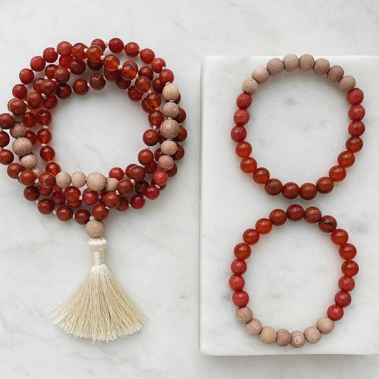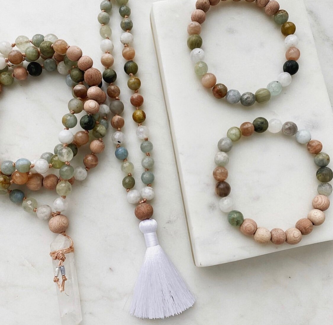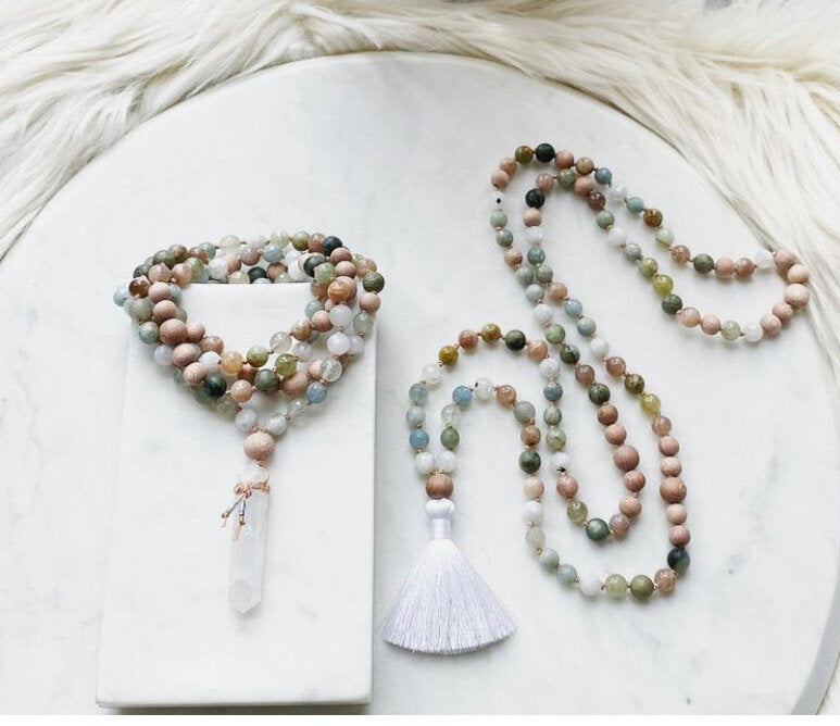 Malas are one of the latest fashion trends to hit the yoga space, but their origin and history goes back to the birthplace of yoga. The term mala is derived from the Sanskrit word “Japamala,” which is a string of beads used for prayer and meditation by Hindus and Buddhists (similar to the concept of a Rosary in the Catholic faith). The string is made up of 108 individual beads, which are used to keep count while chanting or repeating a mantra while meditating. Our Malas can also be used to diffuse essential oils on the lava rock or rosewood beads.