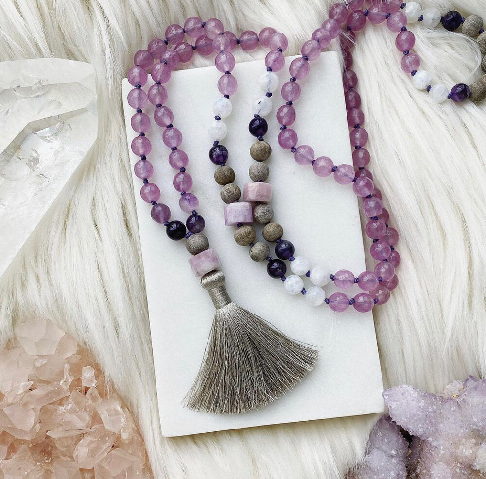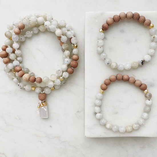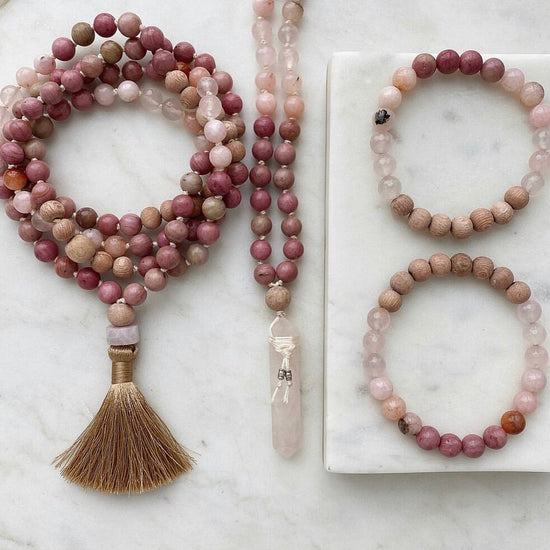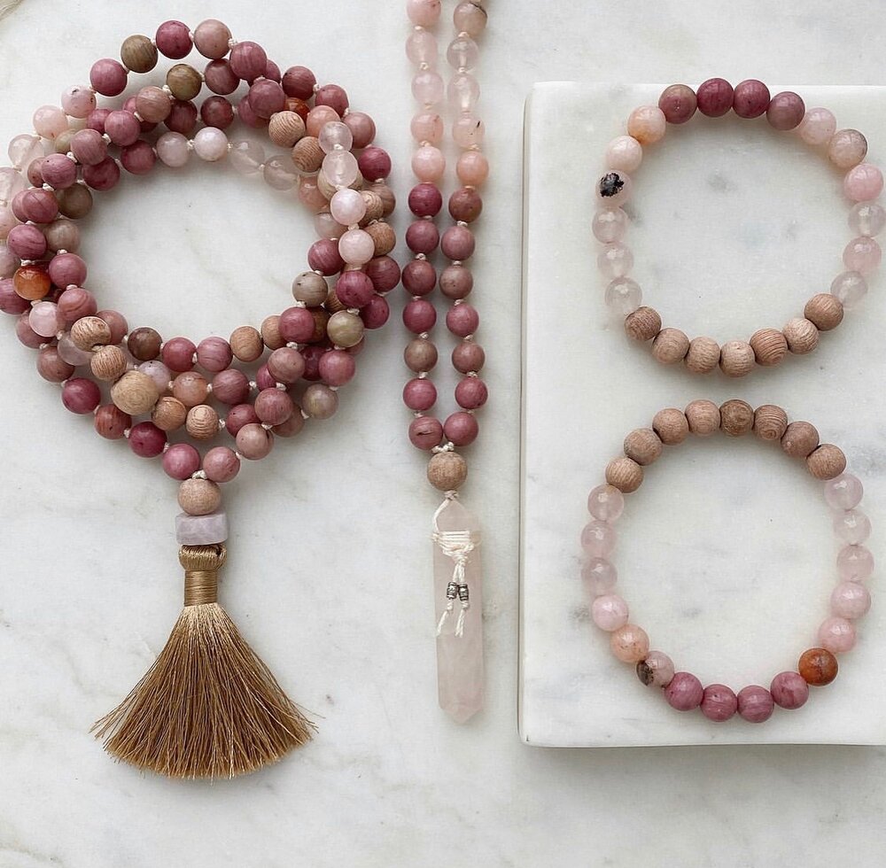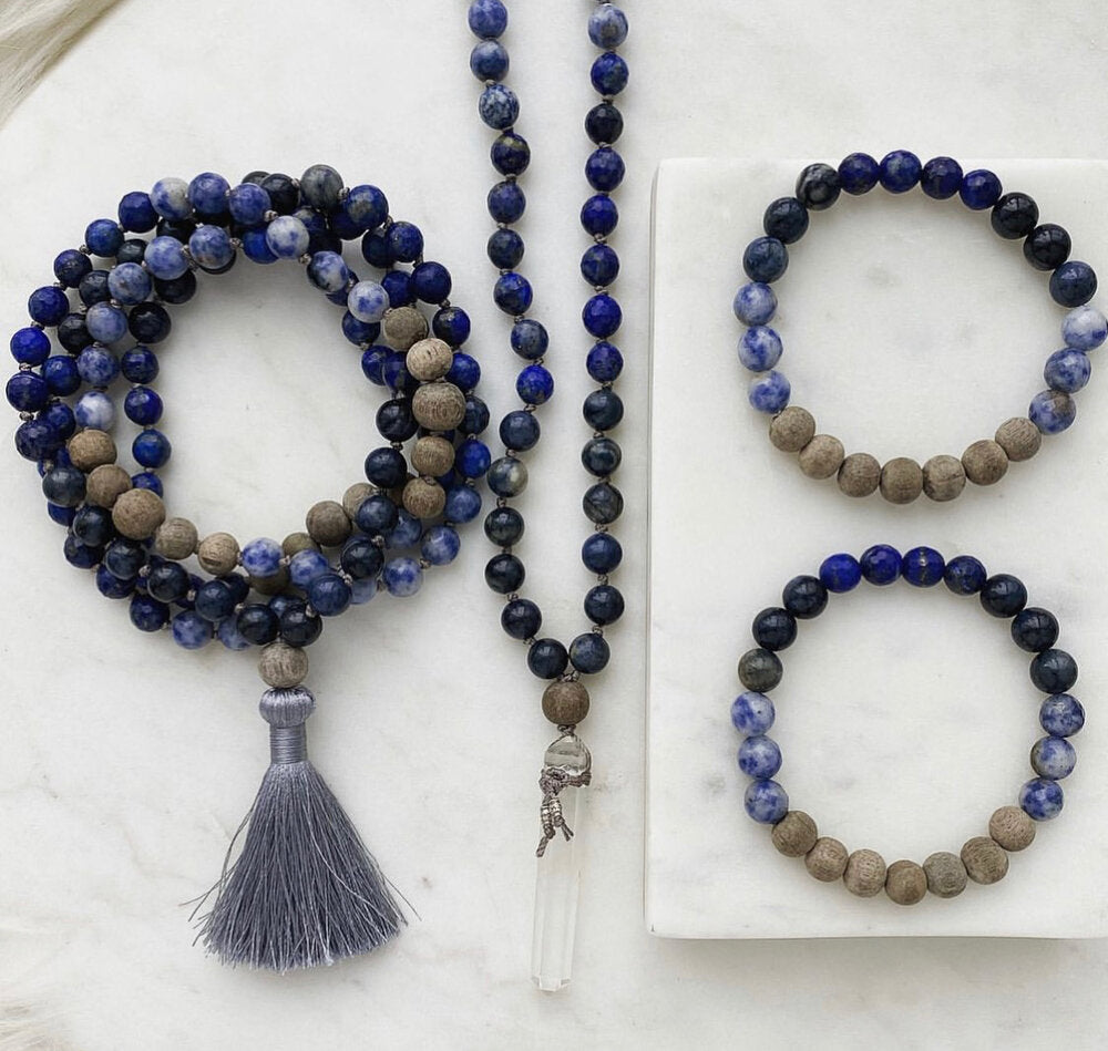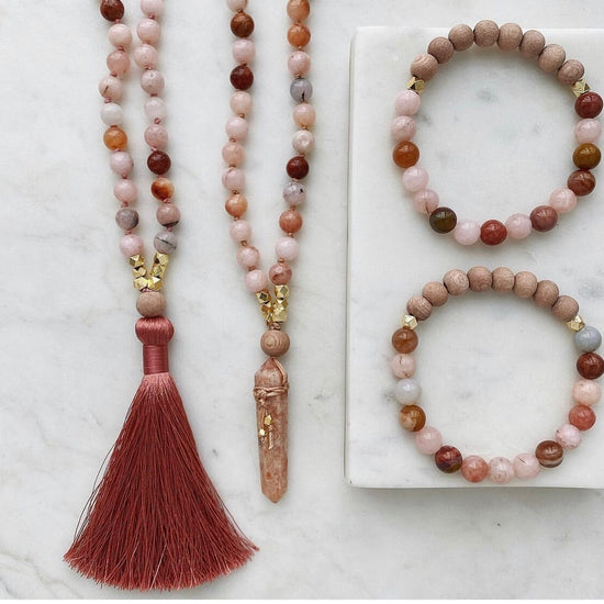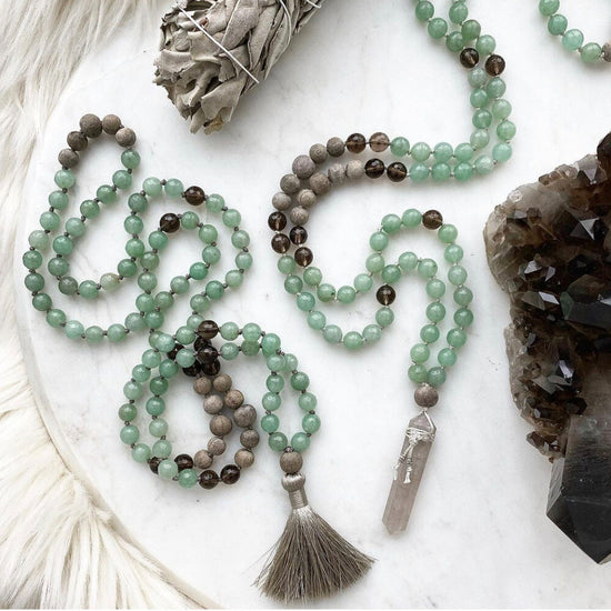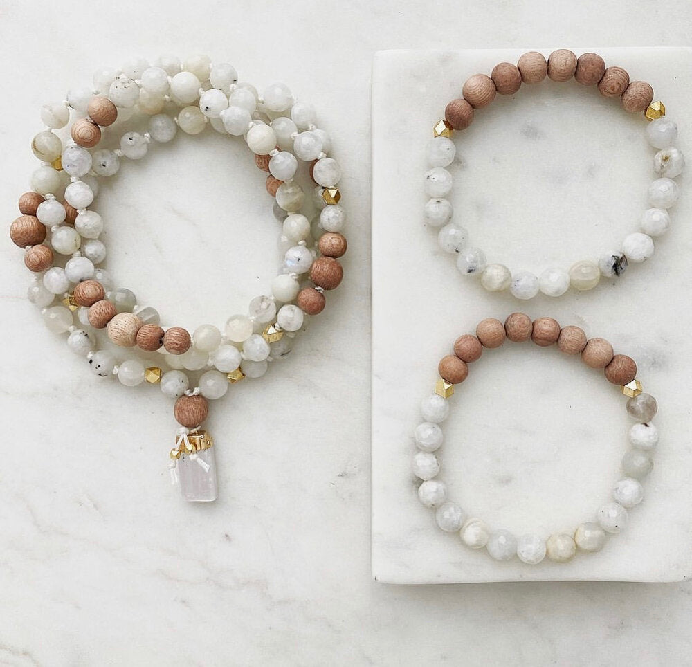 Malas are one of the latest fashion trends to hit the yoga space, but their origin and history goes back to the birthplace of yoga. The term mala is derived from the Sanskrit word “Japamala,” which is a string of beads used for prayer and meditation by Hindus and Buddhists (similar to the concept of a Rosary in the Catholic faith). The string is made up of 108 individual beads, which are used to keep count while chanting or repeating a mantra while meditating. Our Malas can also be used to diffuse essential oils on the lava rock or rosewood beads.