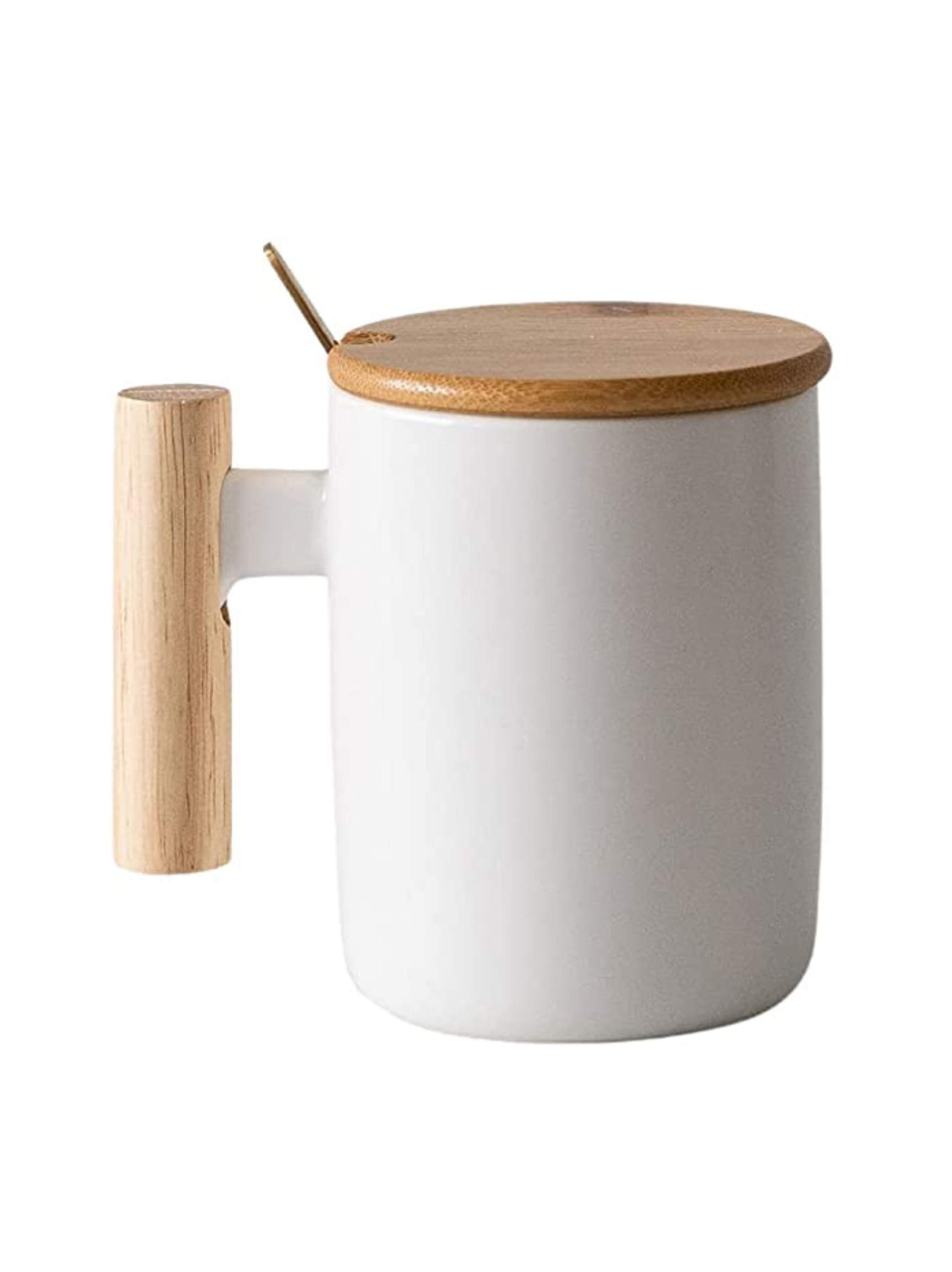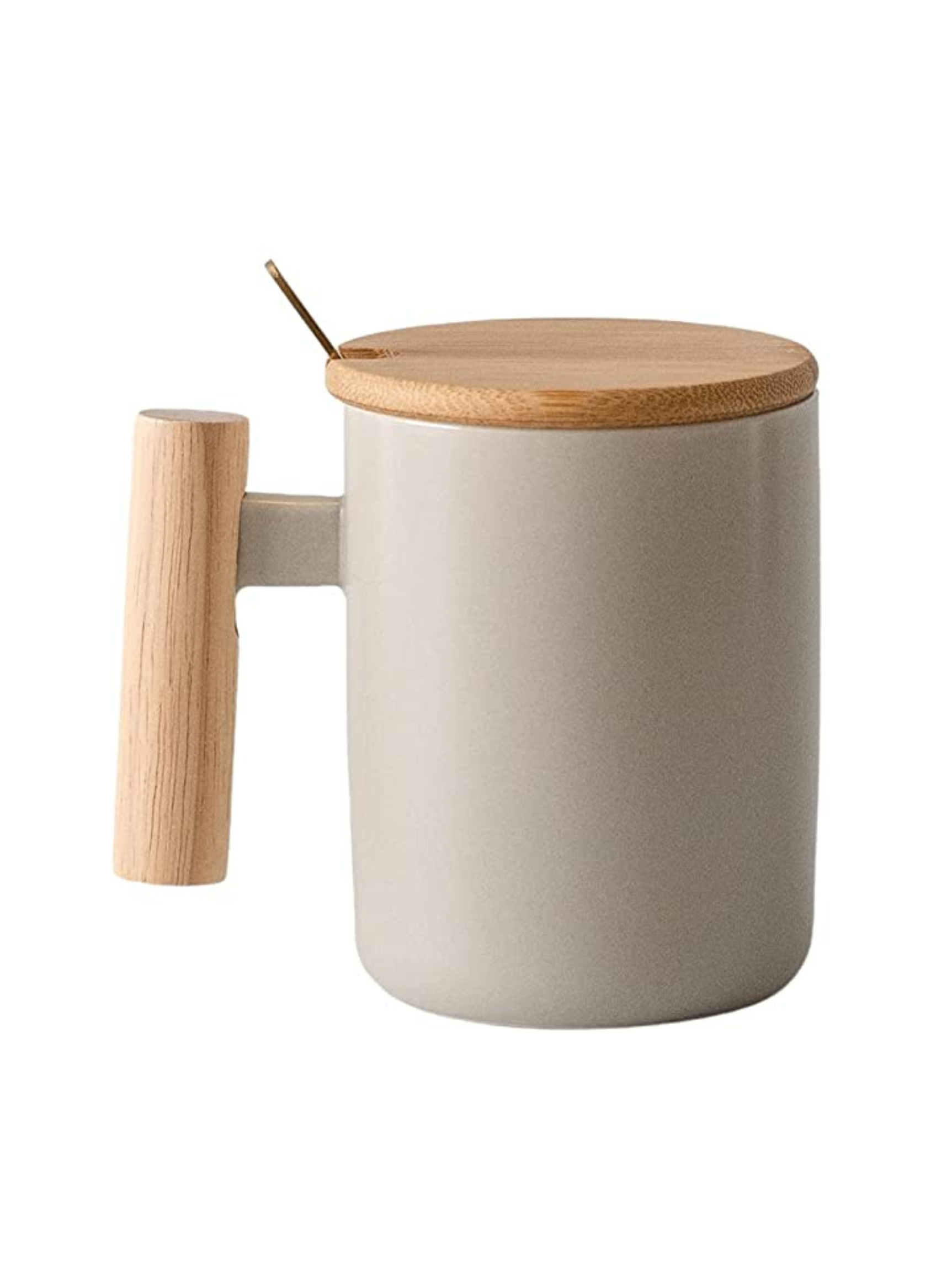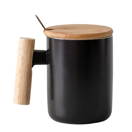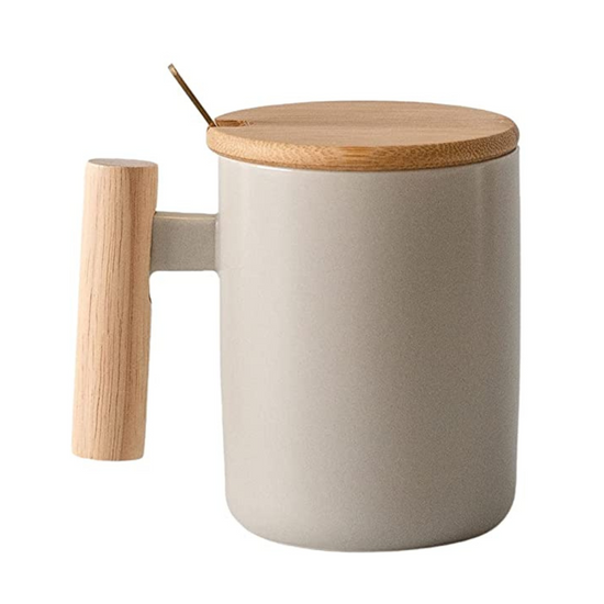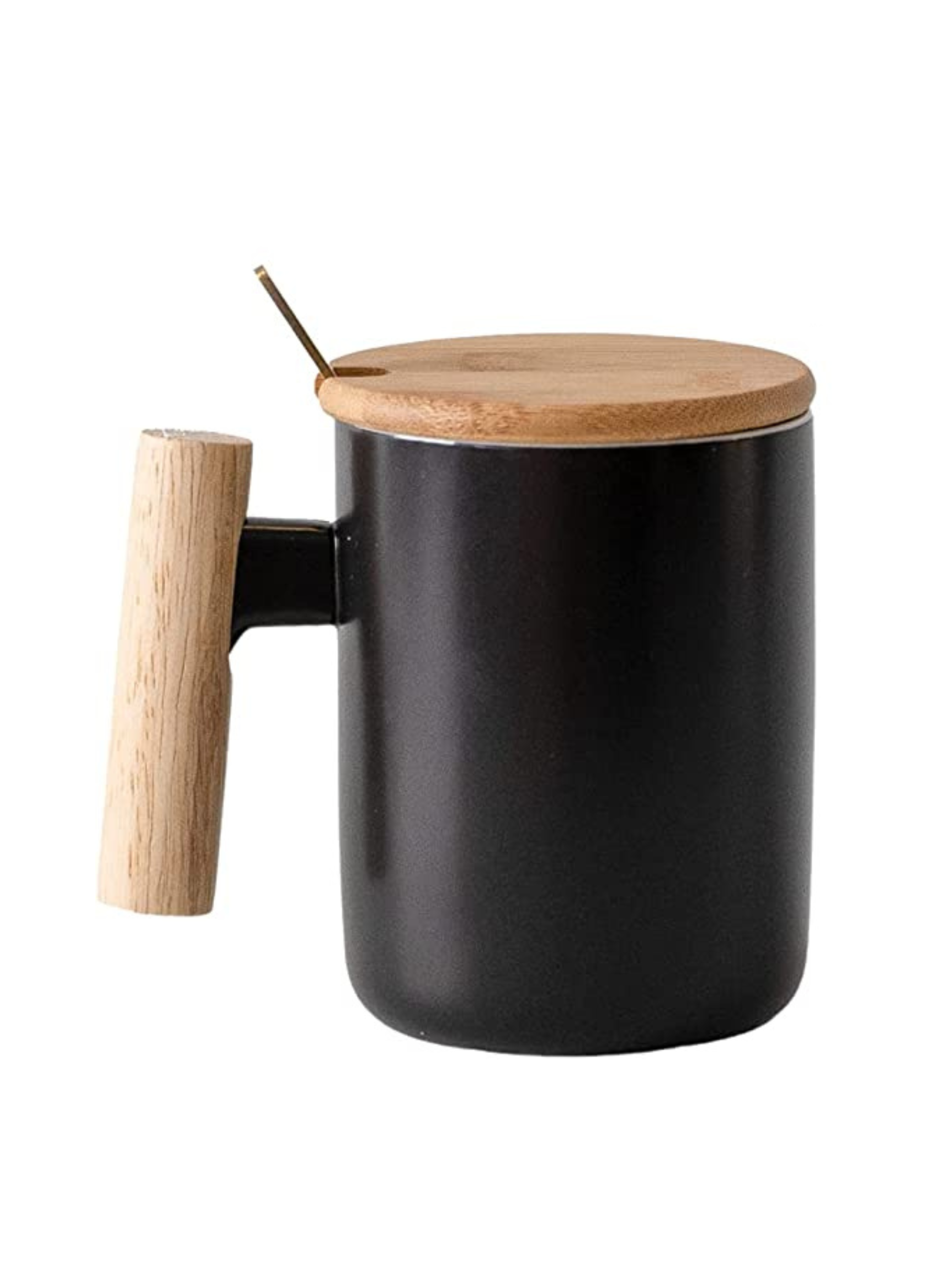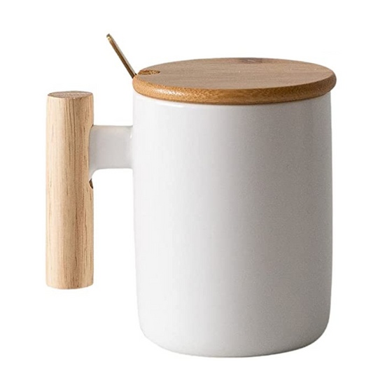 Classic ceramic coffee mug with wood handle, bamboo lid, and metal coffee spoon - a perfect complement for a productive day. Wrap your fingers around a high-temperature porcelain mug to feel the beverage inside.